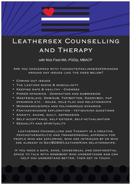 I can offer private counselling and psychotherapy and mentorship around a wide number of issues including counselling for people already in, who are seeking or who are drawn to and want to explore Gay/BDSM/Leather/Kink relationships.